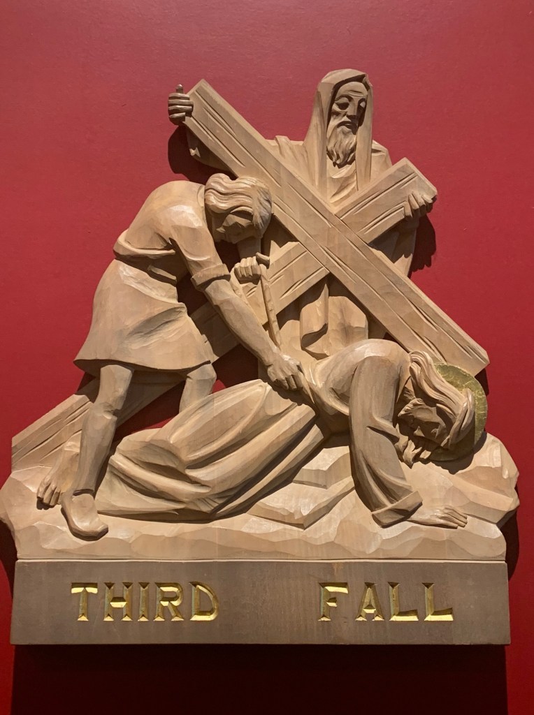 Weakened by torments and by loss of blood, Jesus falls beneath his cross